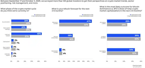 Більшість установ (45%) вважають, що ми перебуваємо на пізньому бичачому ринку . Цей показник значно вищий, ніж у неінституційних організацій (27%). Це свідчить про те, що, незважаючи на оптимізм, фахівці вважають, що ринок вже перебуває у повному розпалі.